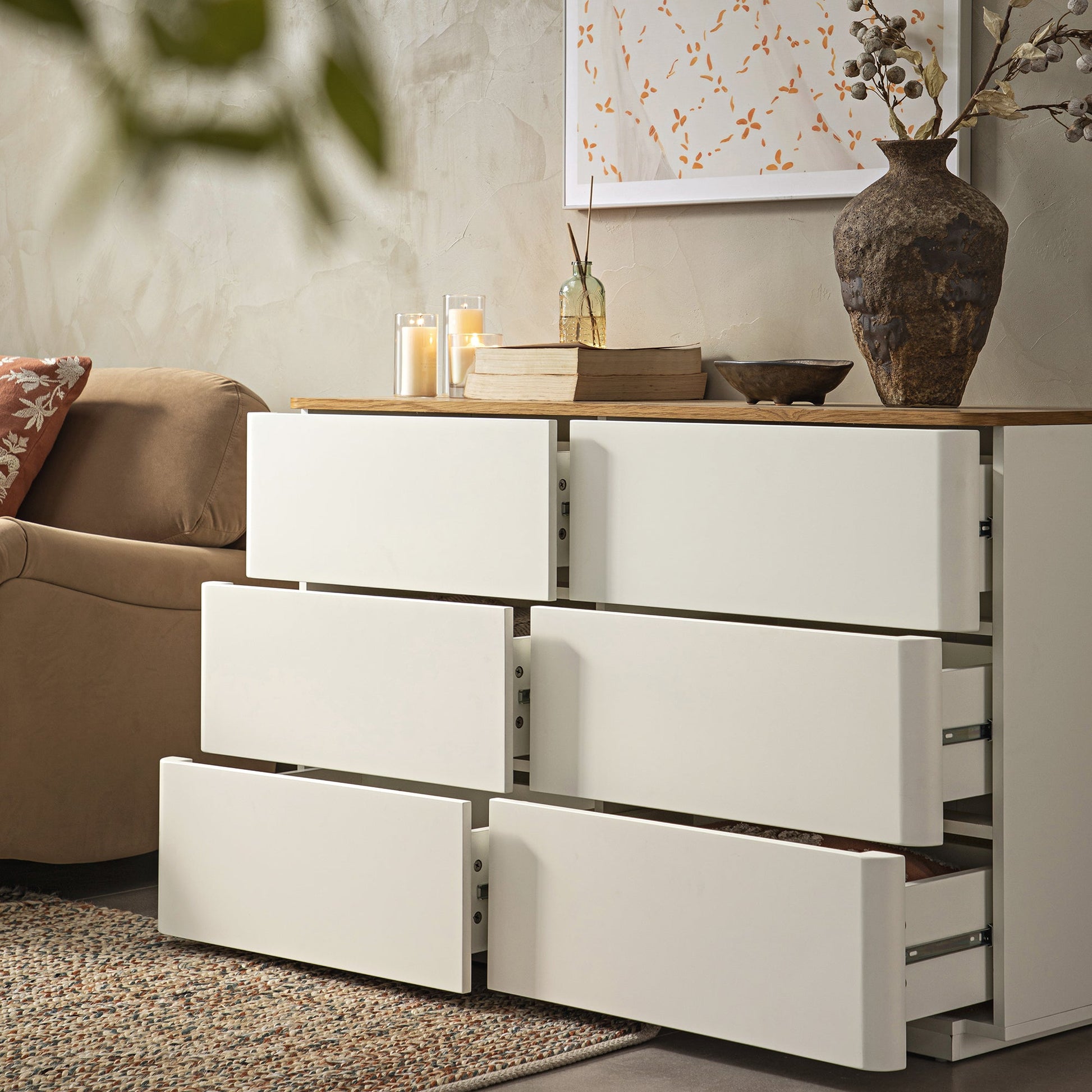 Agnes Curved Edge Chest of 6 Drawers, Off White with Oak Top