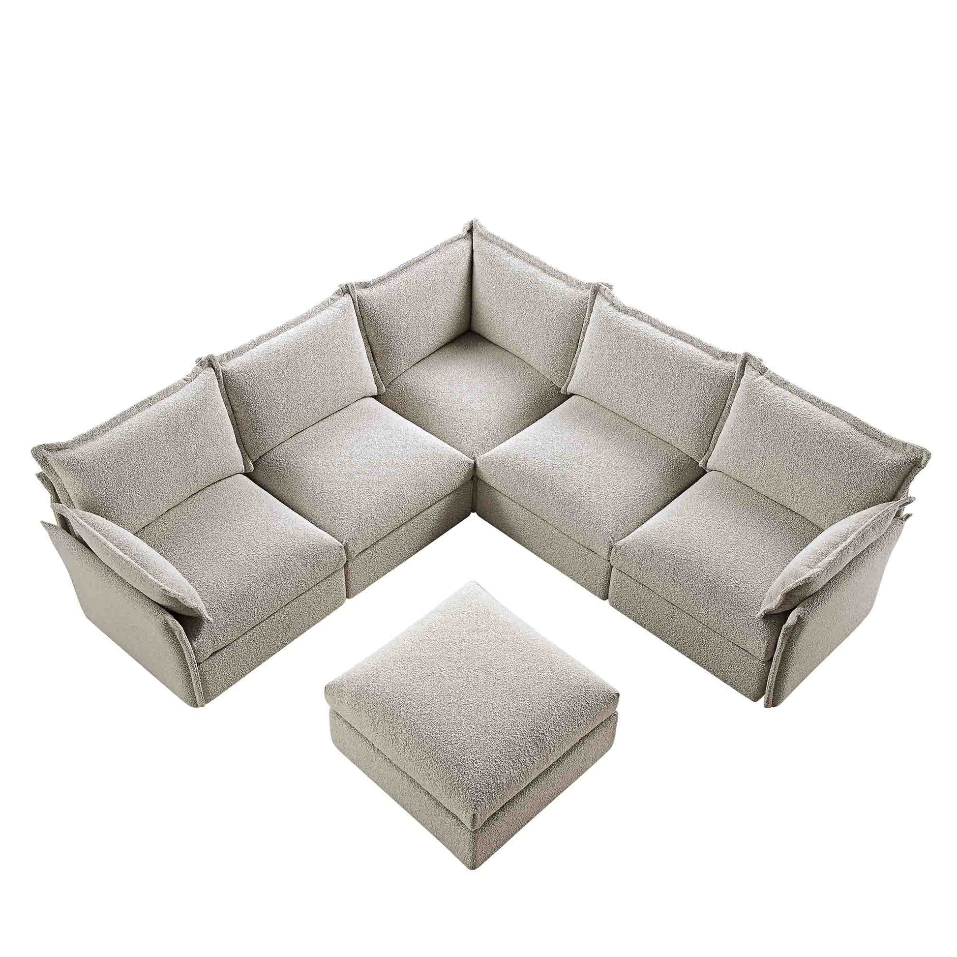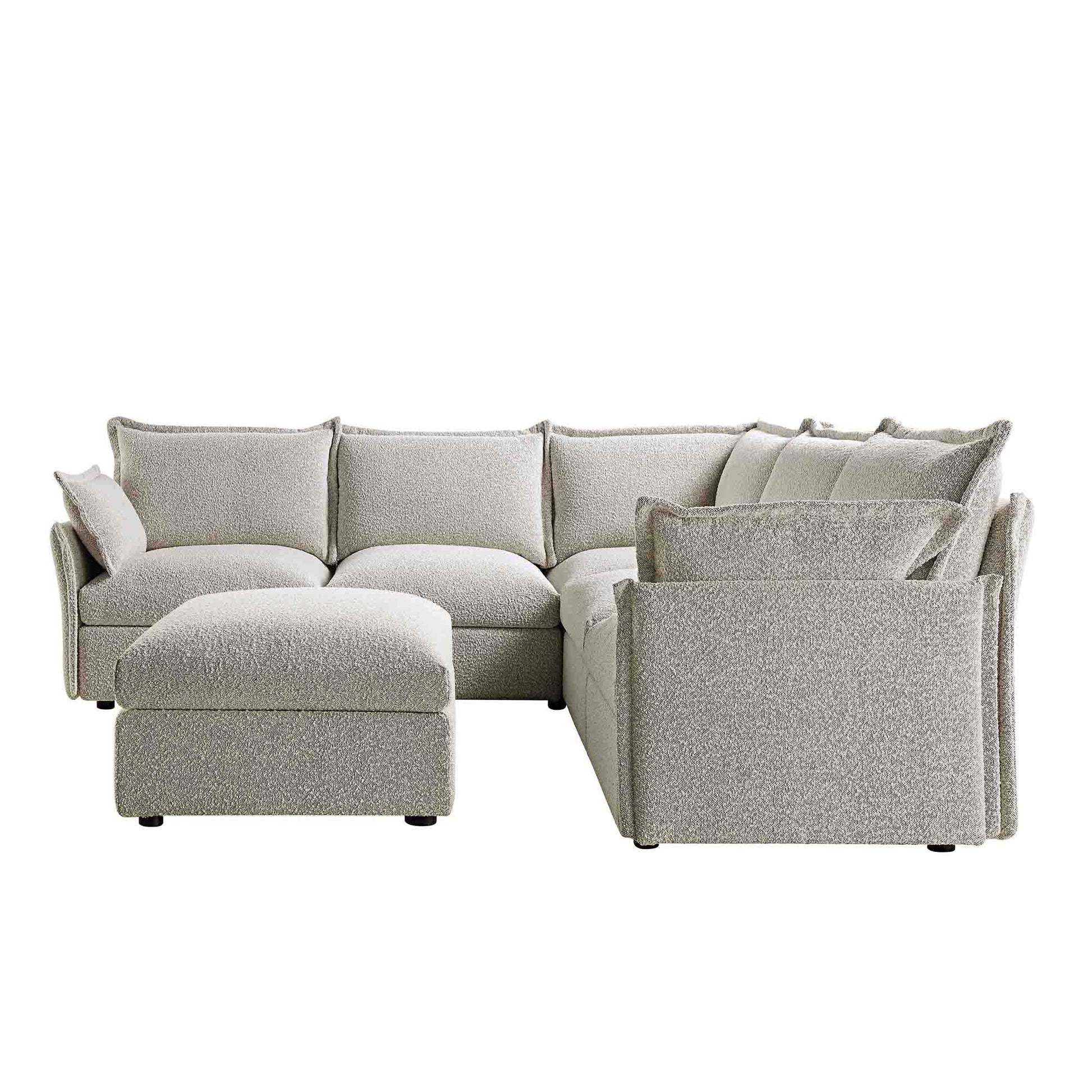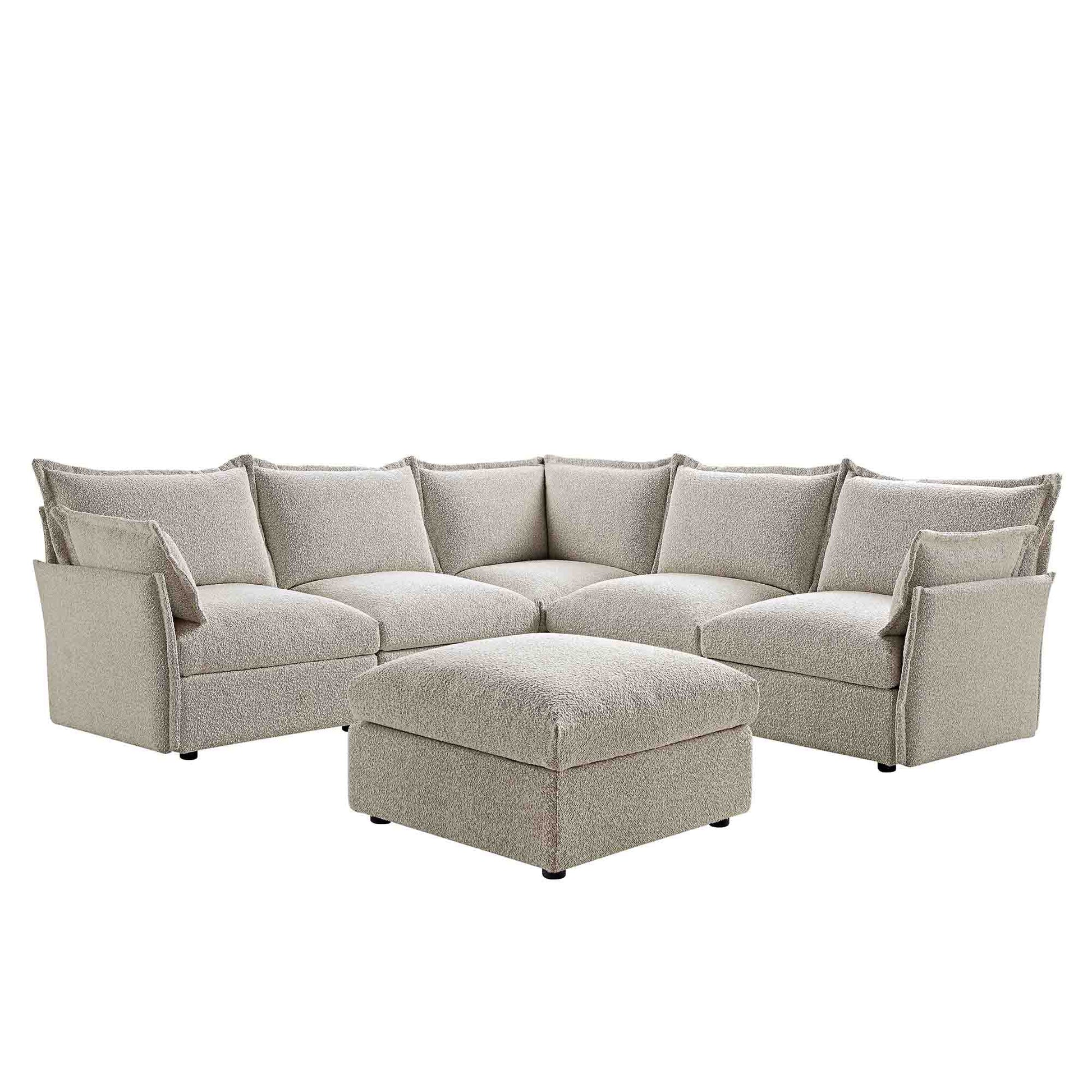 Byron Pillow Edge Mist Grey Boucle Modular Sofa, 5-Seater Corner & Stool Set