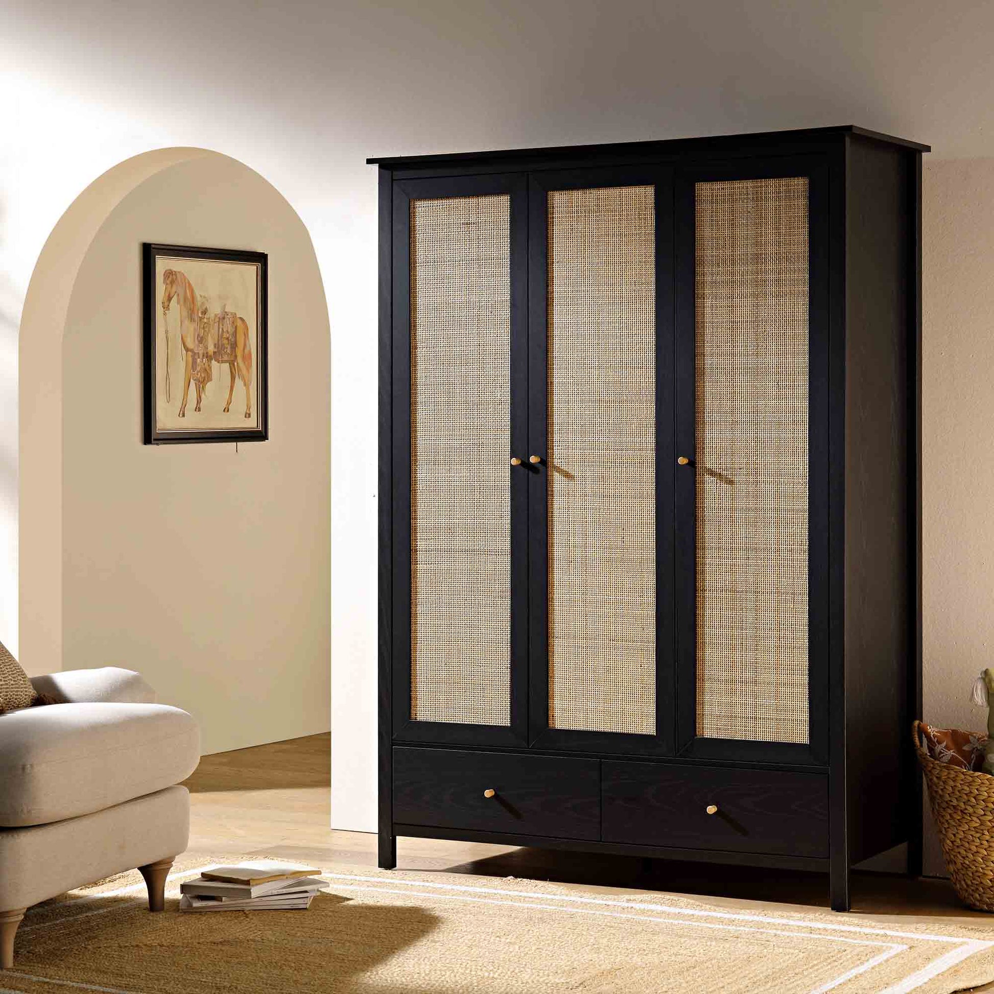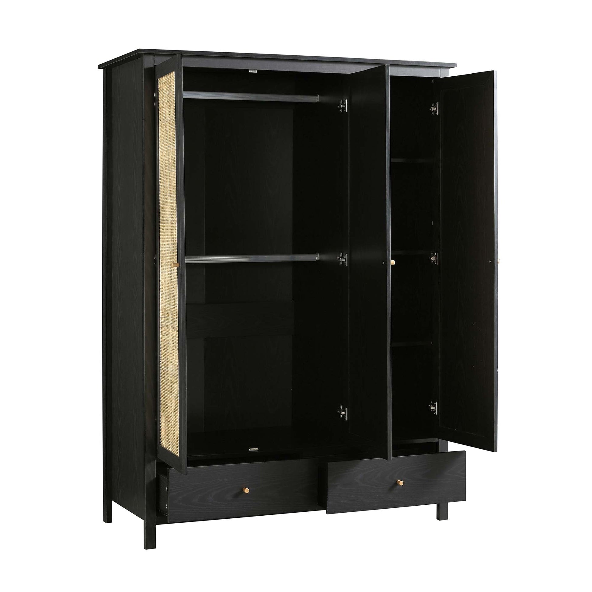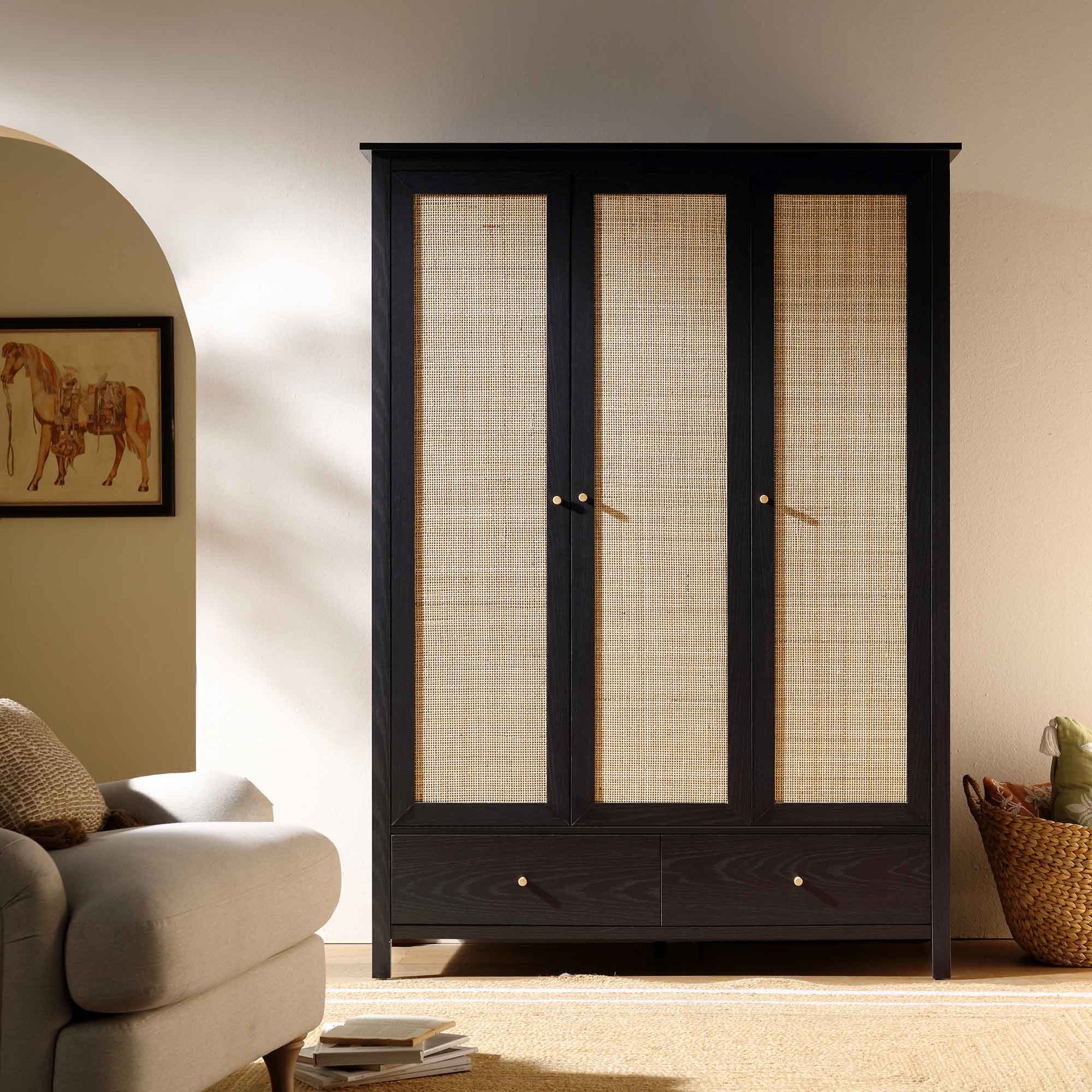 Frances Rattan Triple Wardrobe with 2 Drawers, Black