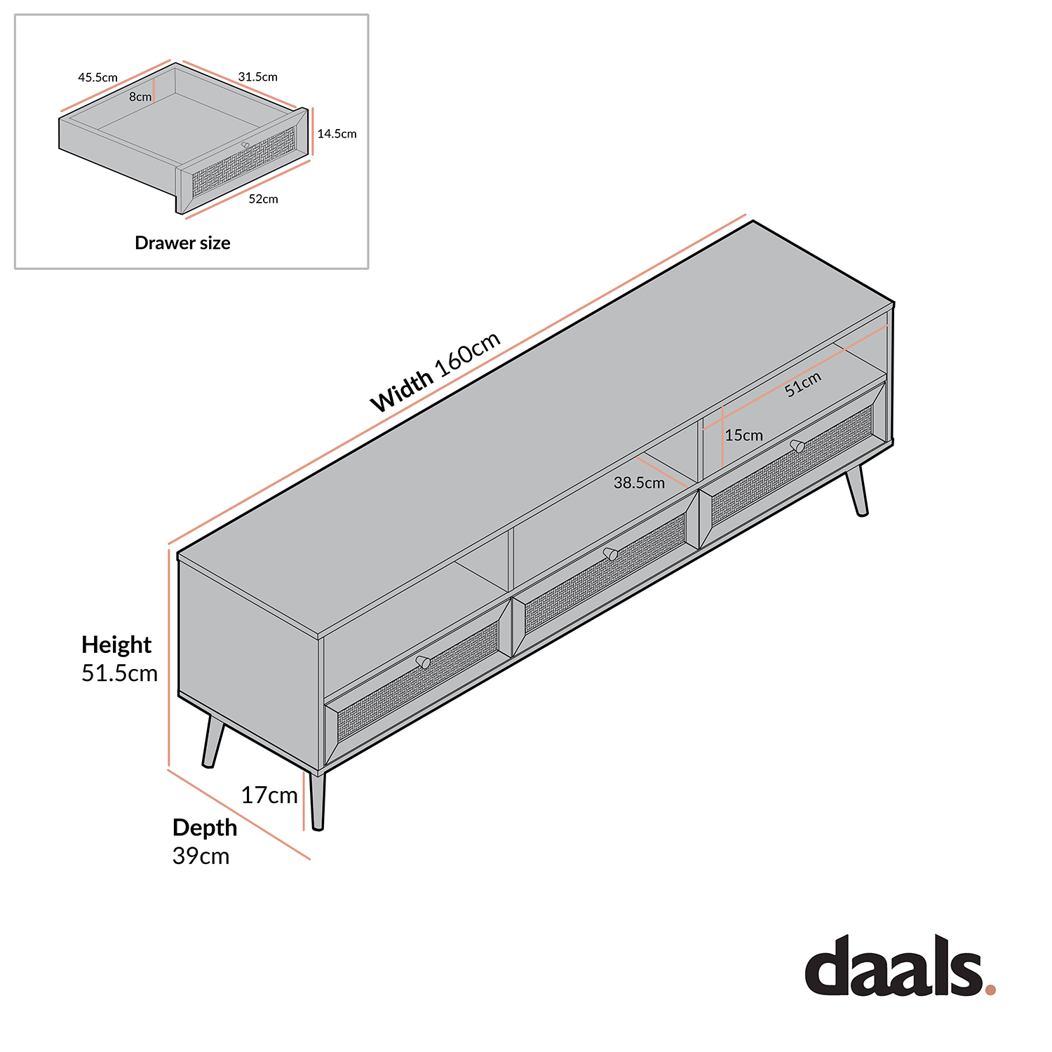 Frances Woven Rattan 160cm 3-Drawer TV Unit, Black