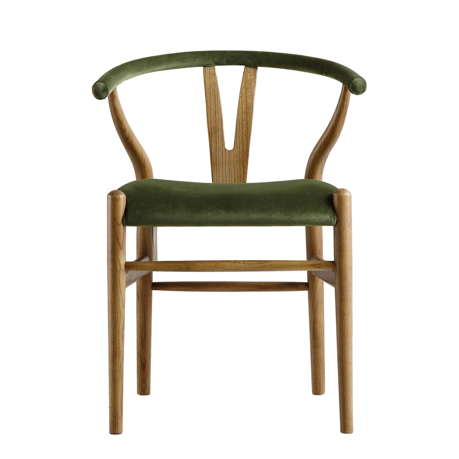 Hansel Upholstered Padded Dining Chair, Moss Green Velvet and Light Walnut Frame