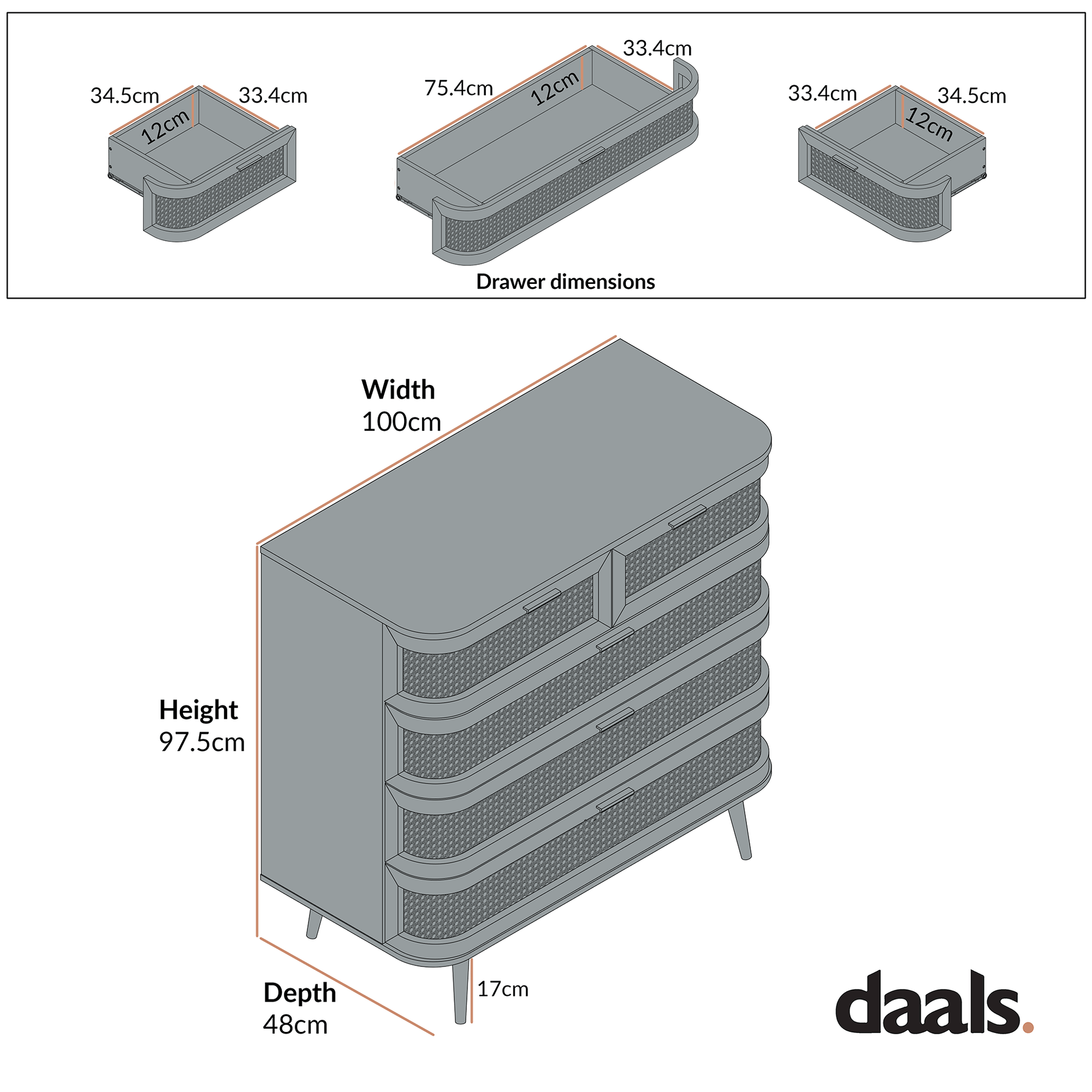 Izzy Curved Rattan Chest of 5 Drawers, White