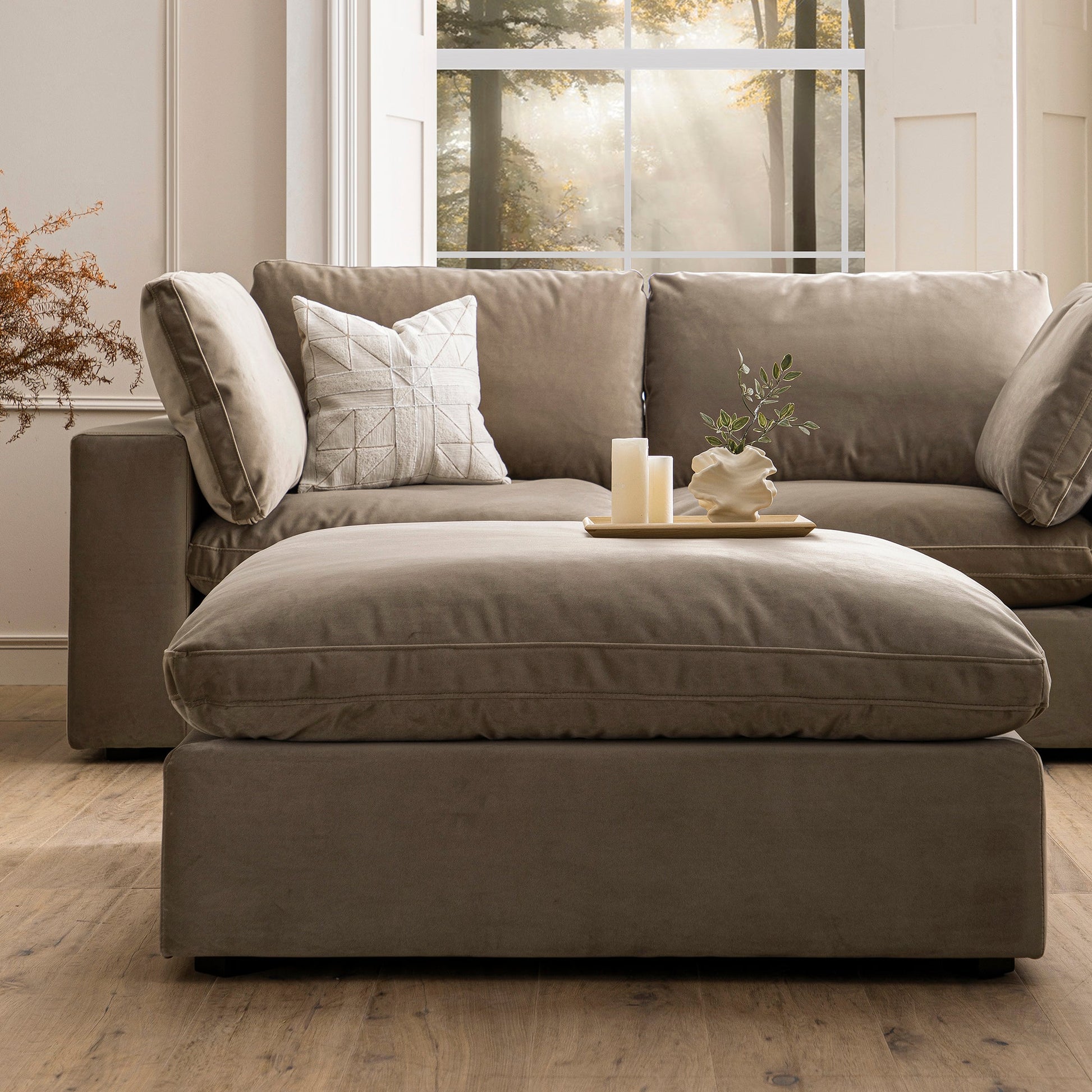 Lutyens Taupe Velvet Modular Sofa, Stool