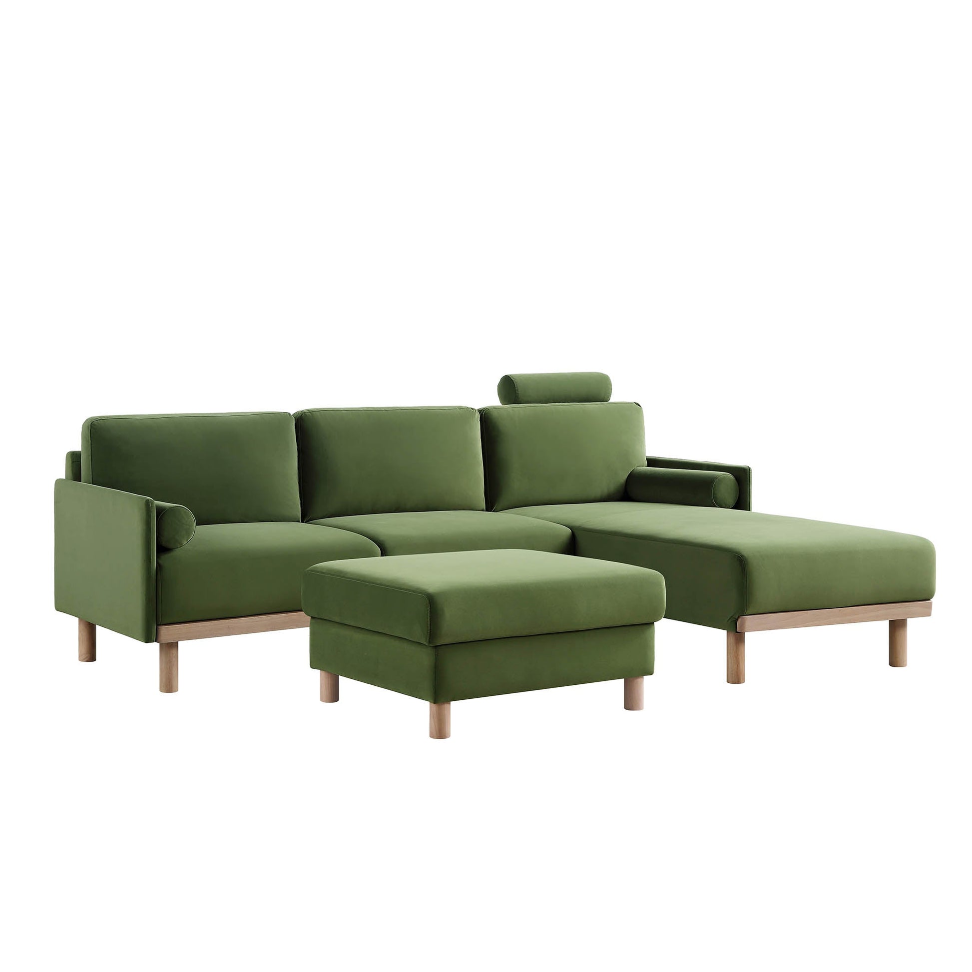 Timber Fern Green Velvet Sofa, Large 3-Seater Chaise Sofa Right Hand Facing